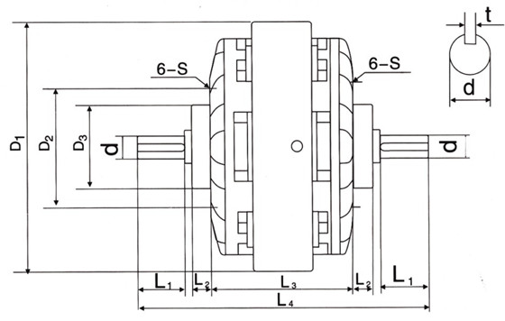 转矩 | 电压 | 转速 | z大 电流A | D1 | D2 | D3 | L1 | L2 | L3 | L4 | 6-S | d | t | 径 | 深 | ||