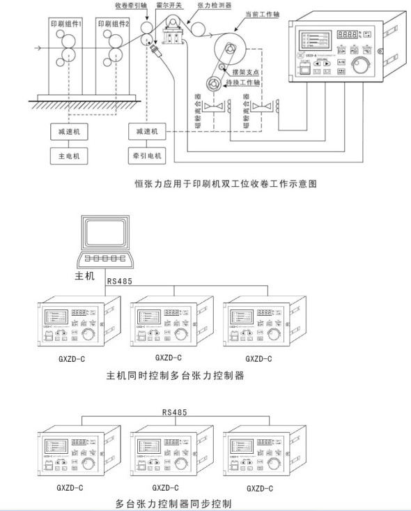 GXZD-C series high-precision automatic constant tension controller is designed for the printing press, which has two output bits of the duplex printing presses rolling to achieve pre-start automatically change axis, with automatic feeding and cutting output cut .